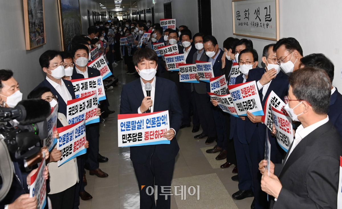이준석 국민의힘 대표가 19일 오전 국회 문화체육간광위원회 복도에서 언론중재법 개정안을 규탄하는 발언을 하고 있다.