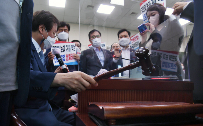여야의 평행선이 이어지자 민주당 의원들은 표결 처리를 요구하고 나섰다. 김승원 의원이 “야당 의원들 반대 논리가 사실 지난달부터 다 거의 비슷한 내용이고, 계속 들으니 마음으로도 지친다”며 “국회법에 정해진 표결에 따라 처리를 하자”고 제안했다. 박정 의원도 “많은 의원들이 평행선을 달리니 (이제는) 결정해야 한다”고 말했다. 결국 회의 2시간이 지난 오후 1시50분 도 위원장이 표결 절차를 진행했다. 국민의힘 의원들이 위원장석을 에워싸고 “여기가 북한이냐” “부끄럽지 않느냐”며 거세게 항의하는 동안 민주당 의원들과 김의겸 의원이 찬성의 의미로 자리에서 일어났다.