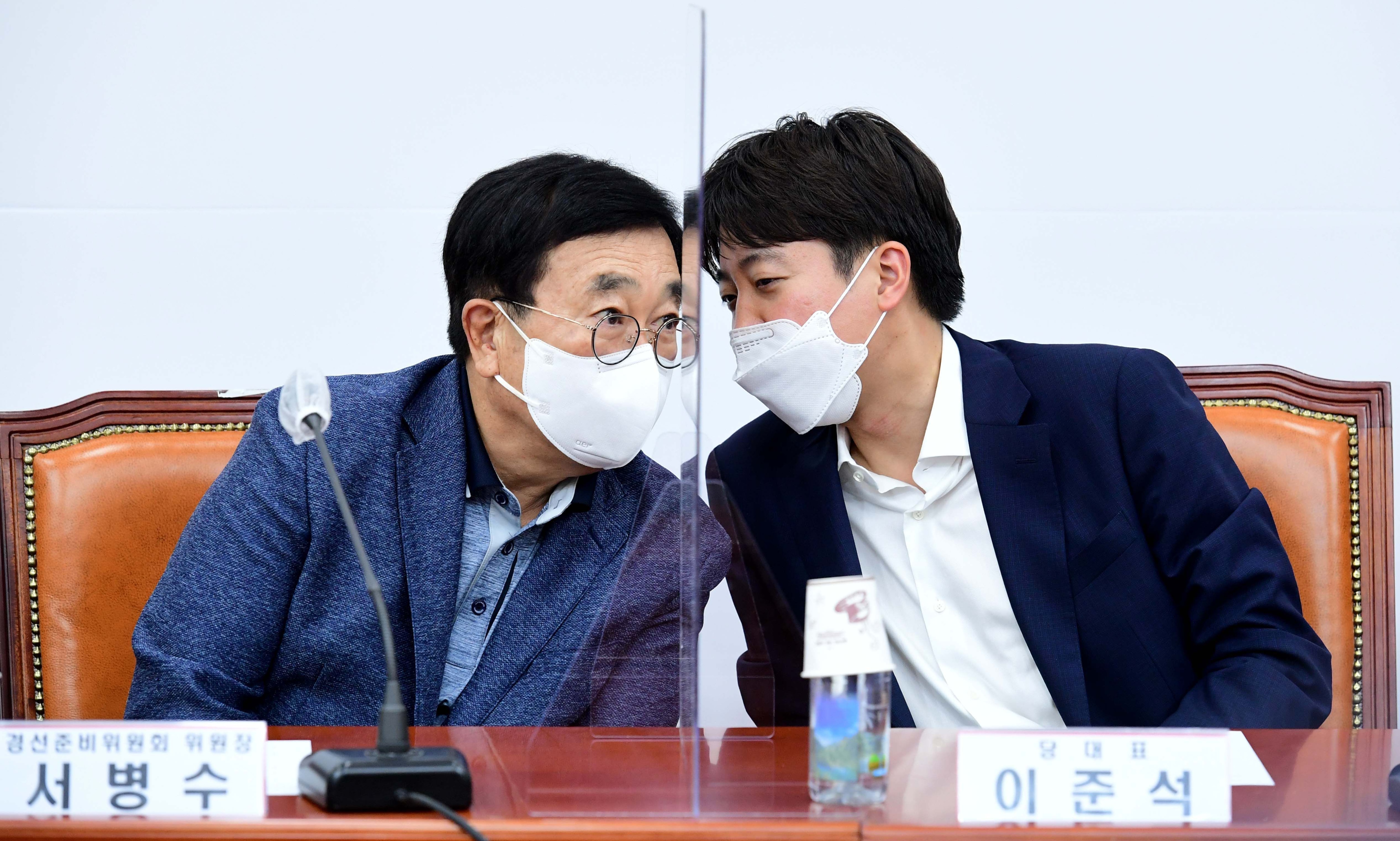 국민의힘 이준석 대표, 서병수 대선 경선준비위원장이 5일 서울 여의도 국회에서 열린 대선 경선 예비후보 전체회의에서 대화하고 있다. /공동취재사진 |