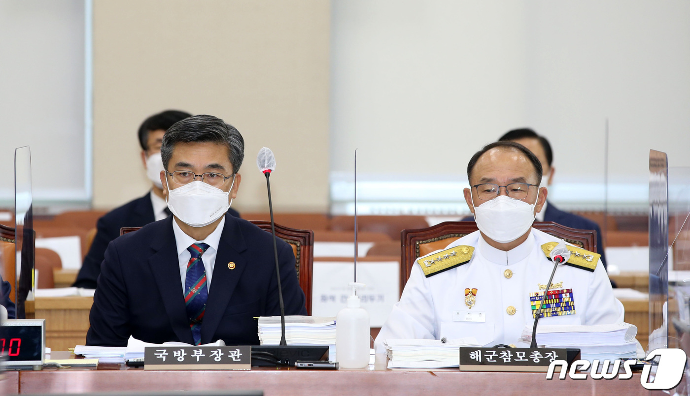서욱 국방부 장관(왼쪽)과 부석종 해군참모총장이 20일 국회 국방위원회 전체회의에 출석했다. 2021.8.20/뉴스1 © News1 구윤성 기자 |