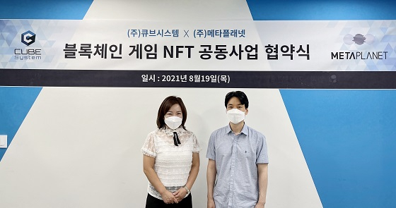 (사진 왼쪽부터)김지윤 메타플래넷 부사장과 신정엽 큐브시스템 대표가 공동사업 협약을 체결하고 기념사진을 찍고 있다/사진제공=큐브시스템 |