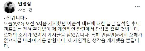 민 특보는 이날 자신의 페이스북을 통해 “오늘 오전 9시쯤 게시했던 이 대표에 대한 글은 윤석열 캠프와는 전혀 관계 없이 제 개인적인 판단에서 단상을 올린 것”이라며 이같이 말했다.