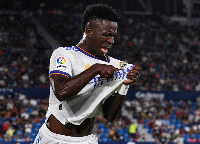레알 마드리드의 비니시우스 주니오르가 22일(현지시간) 레반테와의 2021~2022 스페인 라리가 원정 2라운드에서 후반 40분 3-3 동점골을 넣은 뒤 세리머니를 하고 있다. 발렌시아|로이터 연합뉴스 |