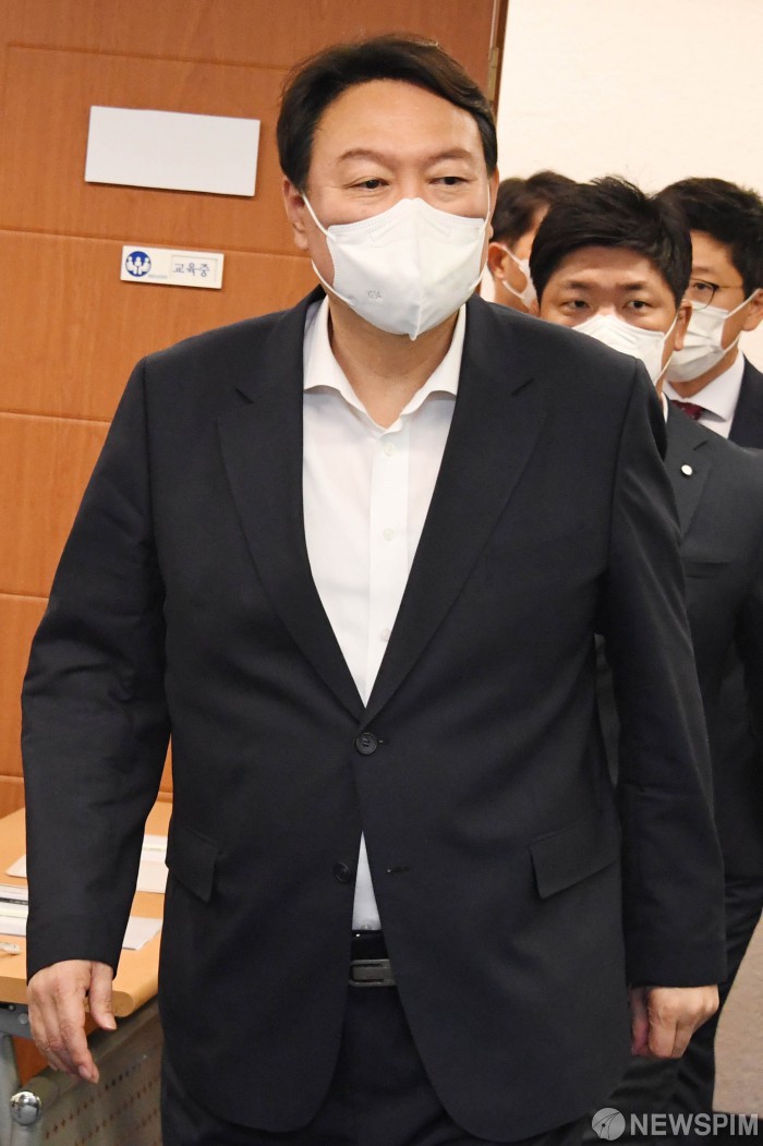[서울=뉴스핌] 국회사진취재단 = 국민의힘 대권주자인 윤석열 전 검찰총장이 지난 22일 서울 종로구 국민캠프에서 열린 자영업 비대위 간담회에 입장하고 있다. 2021.08.22 photo@newspim.com |