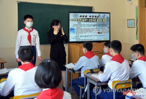 코로나19 방역 교육받는 북한 중학생들 |