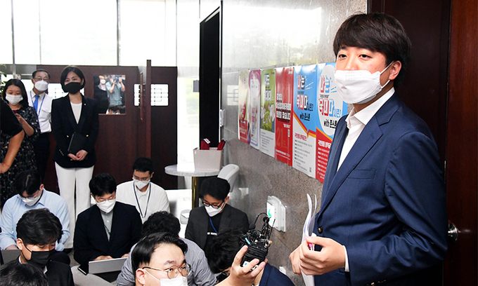 국민의힘 이준석 대표(오른쪽)가 24일 서울 여의도 국회에서 열린 비공개 최고위원회의 결과를 브리핑하고 있다. 이날 회의에선 전날 국민권익위원회가 부동산 불법거래 의혹을 제기한 소속 의원 12명에 대한 명단 공개 및 처분 수위 등이 논의됐다. 서상배 선임기자 |