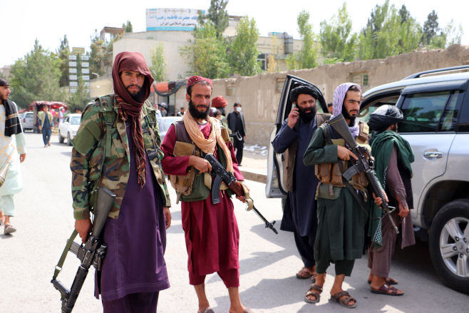 이슬람 무장조직 탈레반 병사들이 22일(현지시간) 아프가니스탄 카불 시내 순찰을 돌고 있다./사진=카불 UPI=연합뉴스 |