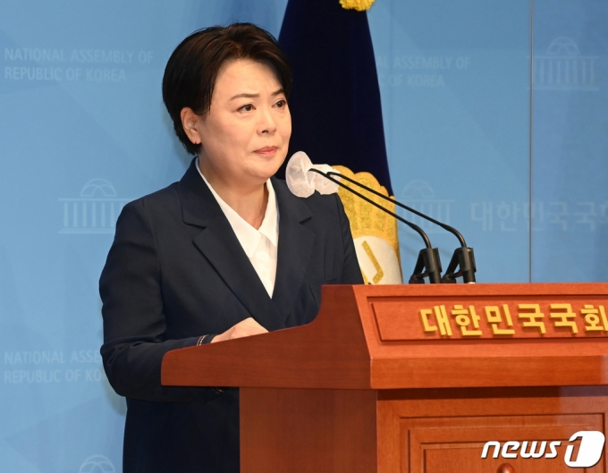 국민의힘 대선주자인 윤희숙 의원이 25일 오전 국회 소통관에서 기자회견을 열고 대선 경선 및 의원직 사퇴 의사를 밝히고 있다. /사진=뉴스1 |