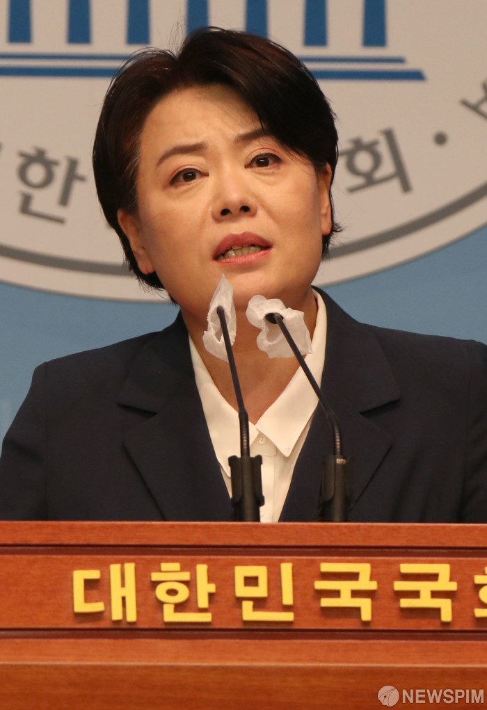 [서울=뉴스핌] 최상수 기자 = 국민권익위원회 조사에서 부동산 관련 불법 의혹이 제기된 국민의힘 윤희숙 의원이 25일 서울 여의도 국회 소통관에서 기자회견을 하고 있다. 윤 의원은 "국회의원직을 서초갑 지역구민과 국민들께 돌려드리겠다"며 의원직 사퇴하고 "이 시간부로 대선후보 경선을 향한 여정을 멈추겠다"며 대선 경선 후보직도 사퇴하겠다고 밝혔다. 2021.08.25 kilroy023@newspim.com