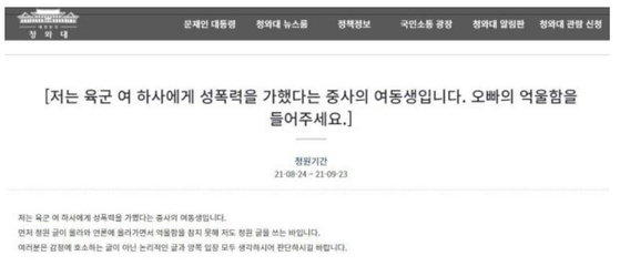 지난 24일 청와대 국민청원 게시판에는 ‘오빠의 억울함을 들어주세요’라는 제목의 청원이 게시됐다. 이 청원은 성폭력 사건 가해자로 알려진 육군 중사의 여동생이 작성했다.