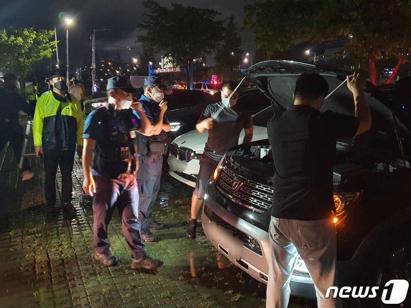 (부산=뉴스1) 노경민 기자 = 25일 오후 부산 사상구 삼락생태공원 제2주차장에서 자영업자들이 '이제는 거리두기 보이콧(Boycott) with 코로나'라는 문구의 플랜카드를 부착하고 차량 시위를 준비하자 경찰이 이를 지켜보고 있다. 2021.8.25/뉴스1