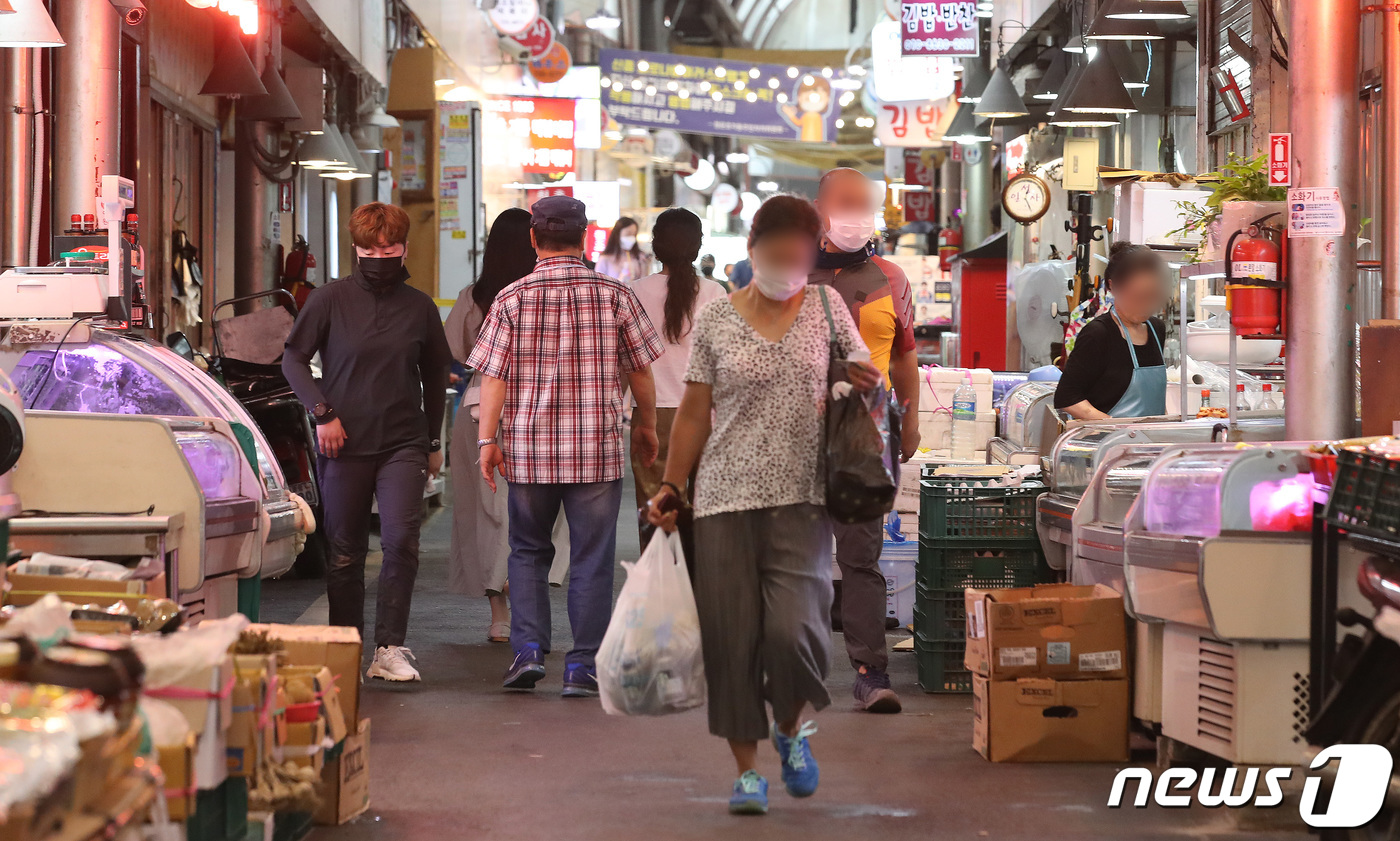 (서울=뉴스1) 임세영 기자 = 정부가 소득 하위 88%에 대한 1인당 25만원의 국민지원금(5차 재난지원금)을 추석 이전에 지급 개시하고, 9월 말까지 90% 지급하겠다고 26일 밝혔다. 국민지원금은 이 같은 내수 활성화 대책에 핵심이다. 월별 건강보험료 납부 기준으로 소득 하위 80%를 선별하면서, 소득 기준으로 역차별 논란이 일었던 1인 가구와 맞벌이 가구에 대해서는 완화된 지급 요건을 적용한다. 사진은 이날 서울 시내의 한 전통시장 모습. 2021.8.26/뉴스1