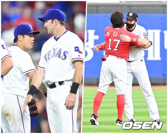 텍사스 함께 뛰었던 추신수와 호잉이 4년만에 KBO리그에서 조우한 것. 호잉과 추신수는 10여분 넘게 이야기를 나누며 웃음꽃을 피웠다. 그리고 경기 30분전에도 그라운드에서 다시 만난 추신수와 호잉은 MLB 출신 황재균과도 이야기를 나누며 메이저리거 그들만(?)의 대화를 나눴다.