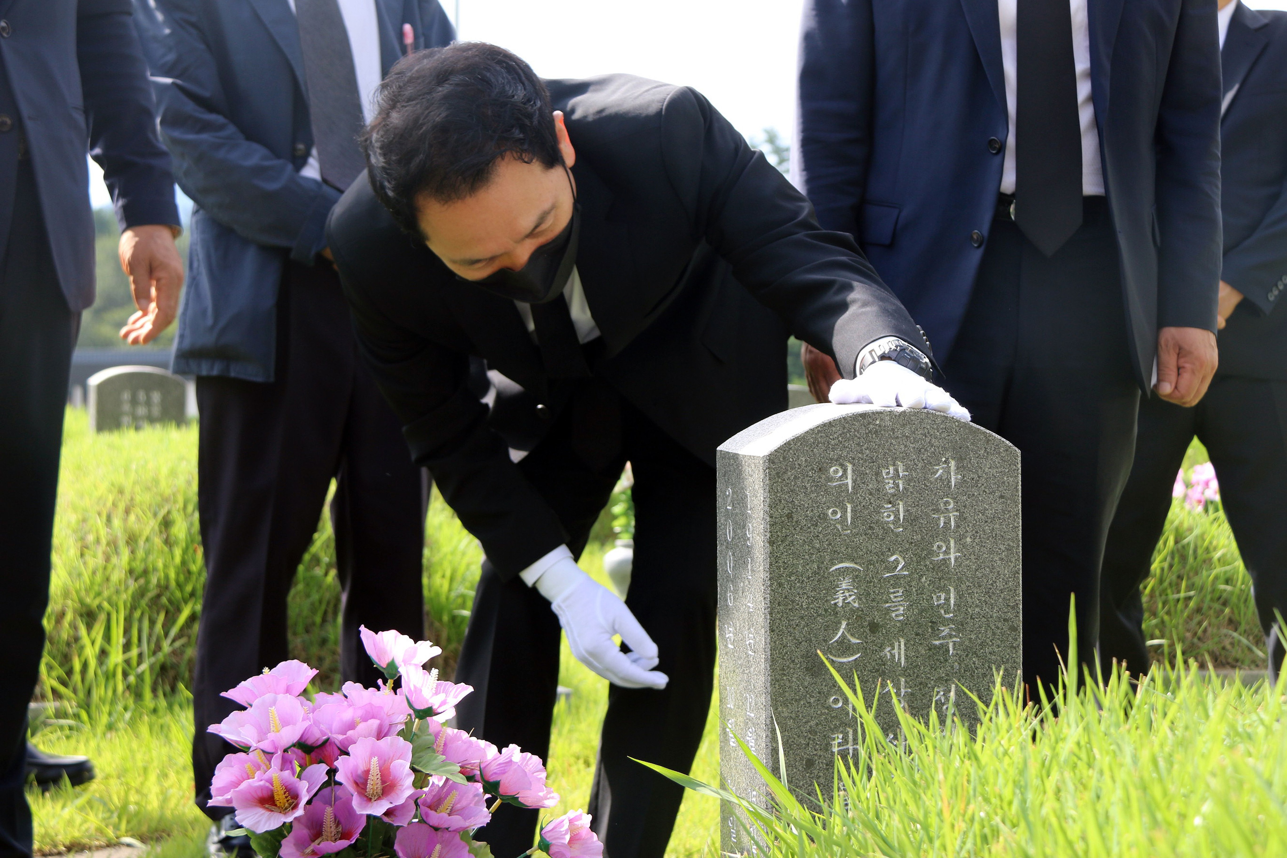 대선 출마를 선언한 국민의힘 장성민 전 의원이 28일 오전 광주 북구 운정동 국립 5·18민주묘지를 참배하고 있다. /연합뉴스 |