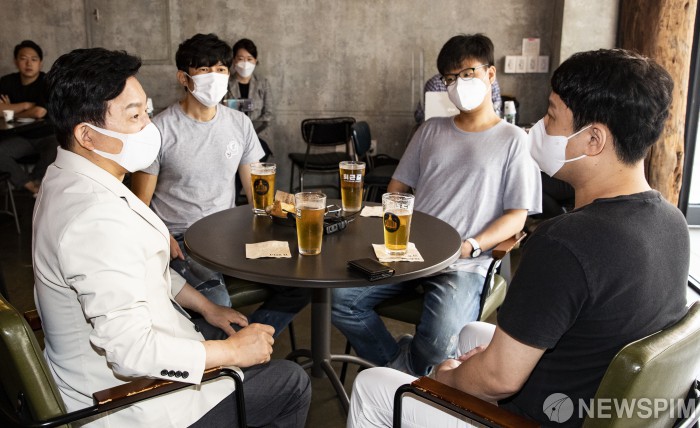 [서울=뉴스핌] 국회사진취재단 = 원희룡 국민의힘 예비후보가 29일 서초구 남부순환로 호프집에서 자영업자들과 간담회를 갖고 코로나 장기화로 인한 자영업자들의 고충에 대해 이야기를 나누고 있다. 2021.08.29 photo@newspim.com