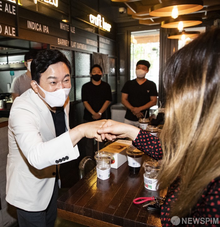 [서울=뉴스핌] 국회사진취재단 = 원희룡 국민의힘 예비후보가 29일 서초구 남부순환로 호프집에서 자영업자들과 간담회를 앞두고 인사를 나누고 있다. 2021.08.29 photo@newspim.com