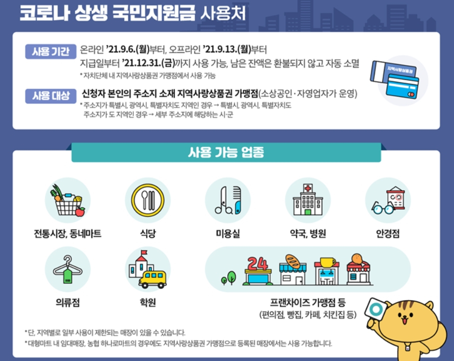 반면 백화점, 복합쇼핑몰이나 대형마트, 기업형 슈퍼마켓, 면세점, 유흥업종·사행산업, 대형 전자판매점 직영매장, 프랜차이즈 직영매장, 대형 외국계매장, 대형 온라인몰, 홈쇼핑, 대형배달앱 등은 사용불가하다. 단, 배달앱으로 주문하더라도 지역사랑상품권 가맹점의 자체 단말기를 사용해 현장에서 결제하는 경우 국민지원금 사용이 가능하다.