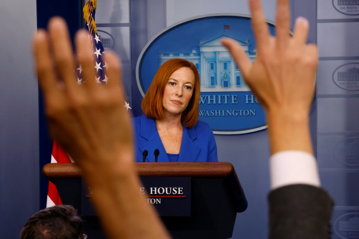 젠 사키 미국 백악관 대변인이 31일(현지시간) 언론 브리핑을 하고 있다. 워싱턴|로이터연합뉴스 |