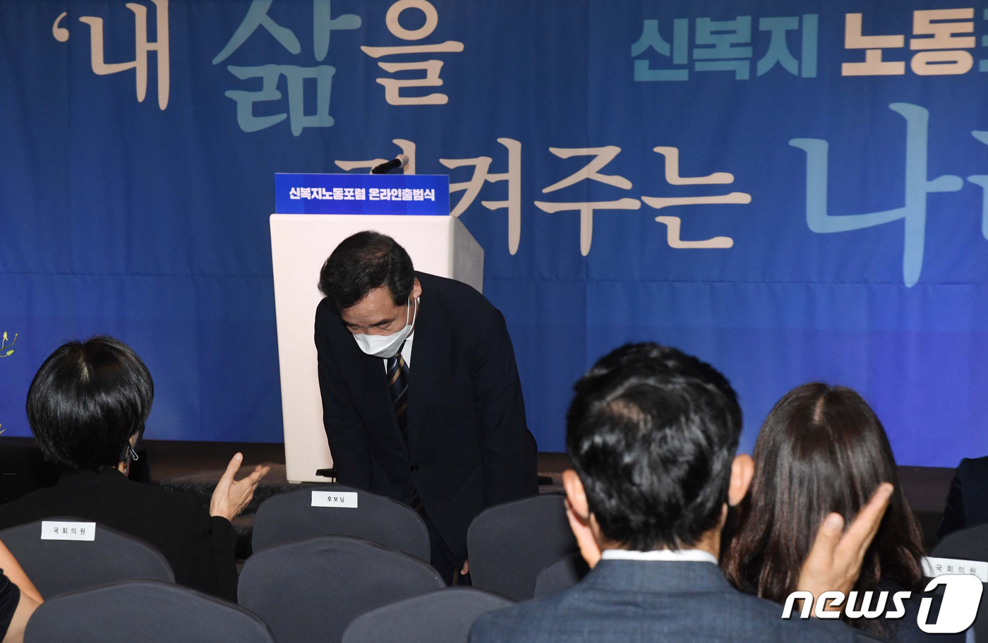 더불어민주당 대선주자인 이낙연 전 대표가 지난 31일 서울 여의도 한국노총에서 열린 신복지노동포럼 출범식에서 참석자들에게 인사하고 있다. © News1 오대일 기자 |