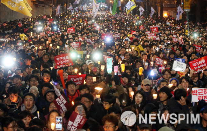 [서울=뉴스핌] 지난 2016년 12월 3일 박근혜 대통령의 즉각 퇴진을 요구하는 6차 촛불집회가 광화문광장에서 열렸다. 2016.12.03 yooksa@newspim.com |