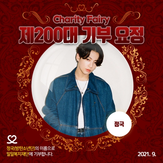‘최애돌’은 정국의 이름으로 ‘밀알복지재단’ 코로나19로 고립된 장애인을 위한 사업에 기부한다. 정국은 지금까지 기부요정 5회로 누적 기부금액 250만 원을 달성했다. ‘최애돌’ 총 누적 기부금액은 2억 5,700만 원이다.