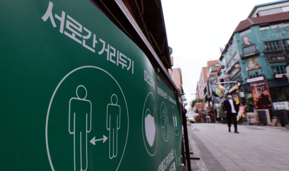 지난 6일 서울 용산구 이태원 세계음식거리 한 가게 입구에 사회적거리두기와 신종 코로나바이러스 감염증(코로나19) 방역 캠페인 내용이 적힌 배너가 세워져 있는 모습. [연합] |
