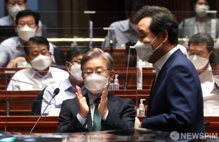 [서울=뉴스핌] 이형석 기자 = 더불어민주당 대선 경선 후보인 이재명 경기도지사가 26일 오전 서울 여의도 국회에서 열린 정기국회대비 의원 워크숍에서 단상으로 향하는 이낙연 전 대표를 향해 박수를 치고 있다. 2021.08.26 leehs@newspim.com |