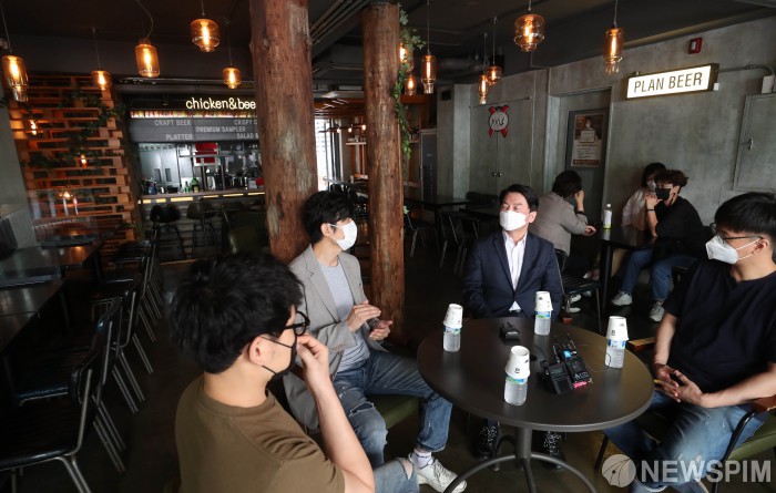 [서울=뉴스핌] 김학선 기자 = 안철수 국민의당 대표가 12일 서울 서초구 양재동의 한 호프집에서 코로나19 대응 전국자영업자비상대책위원회 회원들과 현장 간담회를 하고 있다. 2021.09.12 yooksa@newspim.com