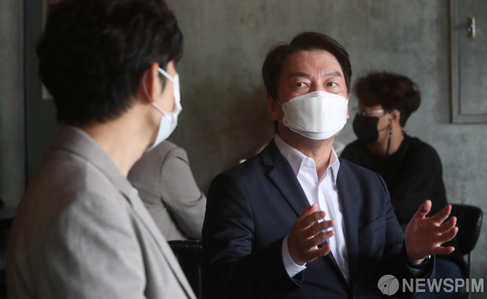 [서울=뉴스핌] 김학선 기자 = 안철수 국민의당 대표가 12일 서울 서초구 양재동의 한 호프집에서 코로나19 대응 전국자영업자비상대책위원회 회원들과 현장 간담회를 하고 있다. 2021.09.12 yooksa@newspim.com