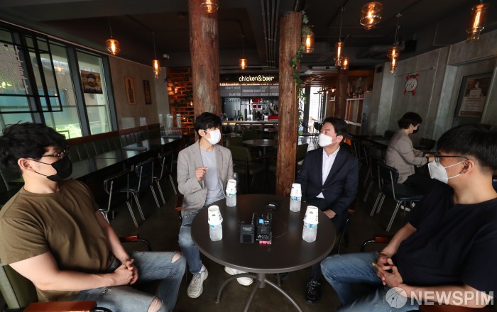 [서울=뉴스핌] 김학선 기자 = 안철수 국민의당 대표가 12일 서울 서초구 양재동의 한 호프집에서 코로나19 대응 전국자영업자비상대책위원회 회원들과 현장 간담회를 하고 있다. 2021.09.12 yooksa@newspim.com