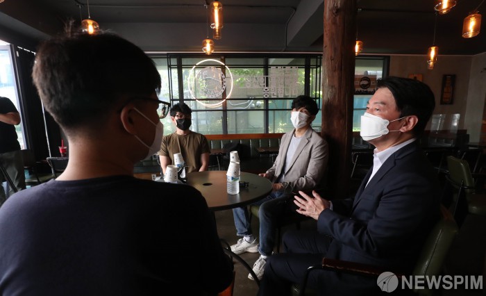 [서울=뉴스핌] 김학선 기자 = 안철수 국민의당 대표가 12일 서울 서초구 양재동의 한 호프집에서 코로나19 대응 전국자영업자비상대책위원회 회원들과 현장 간담회를 하고 있다. 2021.09.12 yooksa@newspim.com