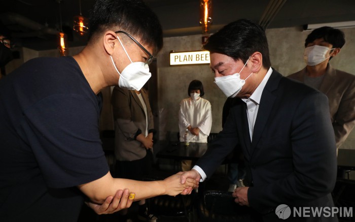 [서울=뉴스핌] 김학선 기자 = 안철수 국민의당 대표가 12일 서울 서초구 양재동의 한 호프집에서 가진 코로나19 대응 전국자영업자비상대책위원회와의 현장 간담회에서 참석자들과 인사를 나누고 있다. 2021.09.12 yooksa@newspim.com
