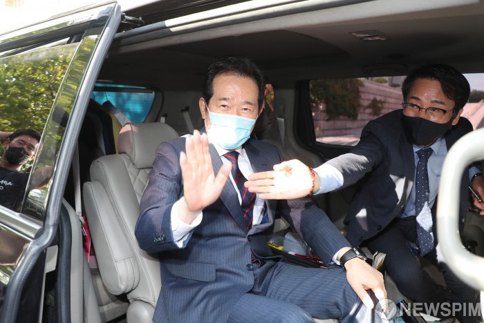 [서울=뉴스핌] 이형석 기자 = 더불어민주당 대권 주자인 정세균 전 국무총리가 13일 서울 여의도 국회 소통관에서 경선후보 사퇴를 선언하는 기자회견을 마치고 차량에 올라 손을 흔들어 인사하고 있다. 2021.09.13 leehs@newspim.com