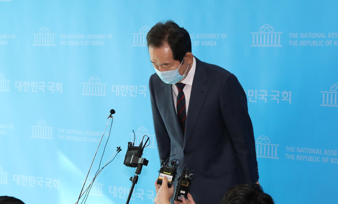 더불어민주당 대권 주자인 정세균 전 국무총리가 13일 서울 여의도 국회 소통관에서 경선후보 사퇴를 선언하는 기자회견을 마치고 취재진 질문에 답한 뒤 인사하고 있다. 공동취재사진 |