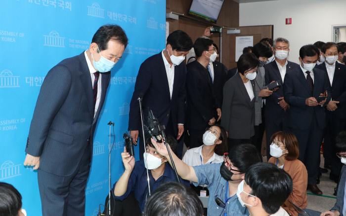 더불어민주당 대선 경선 후보인 정세균 전 국무총리가 13일 오후 국회 소통관에서 후보직 사퇴 기자회견 직후 열린 기자들과의 질의응답에서 인사하고 있다. |국회사진기자단 |