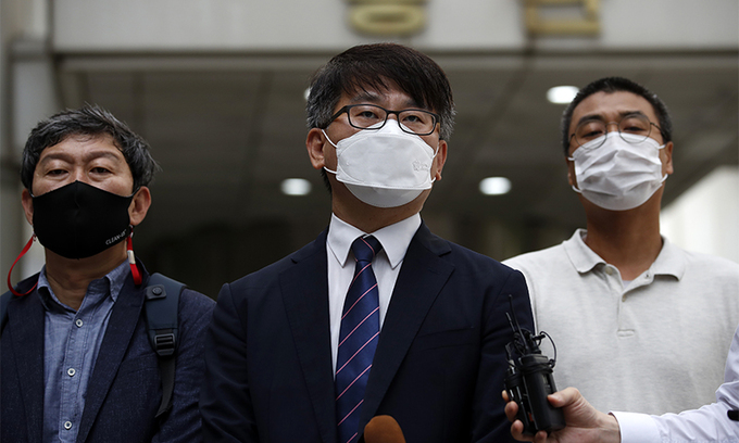 일본 강제징용 피해자 유가족들 측 전범진 변호사가 지난 8일 서울 서초구 서울중앙지방법원에서 열린 정모 씨 등 강제징용 피해자 유가족들이 '일본제철 주식회사'를 상대로 낸 손해배상청구소송 1심을 마치고 입장을 밝히고 있다. 뉴스1 |