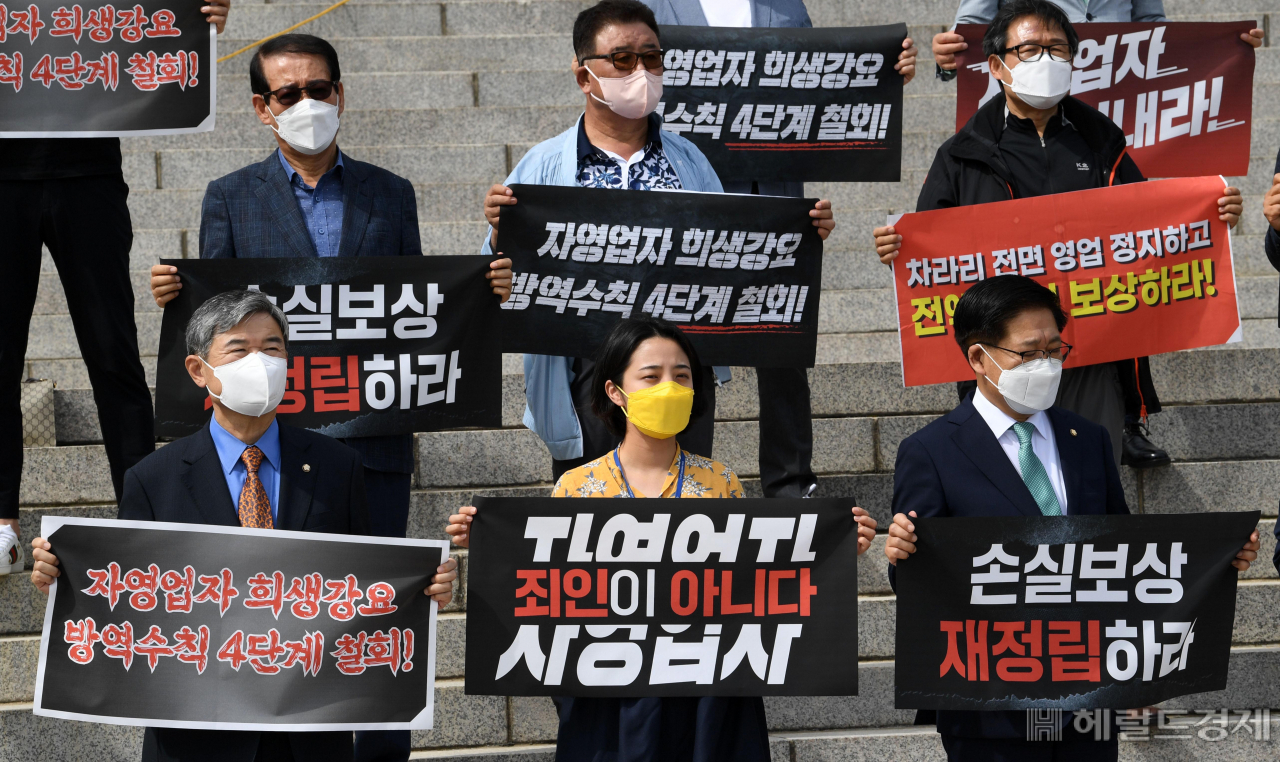 [헤럴드경제=이상섭 기자] 국민의힘 조태용 의원, 정의당 류호정 의원과 자영업자들이 16일 서울 여의도 국회 본청 앞 계단에서 열린 '자영업자들에 대한 정부의 비현실적 손실 보상 규탄 및 대안 마련 촉구 기자회견'에서 손팻말을 들고 방역수칙 4단계 철회 등을 촉구하고 있다. |
