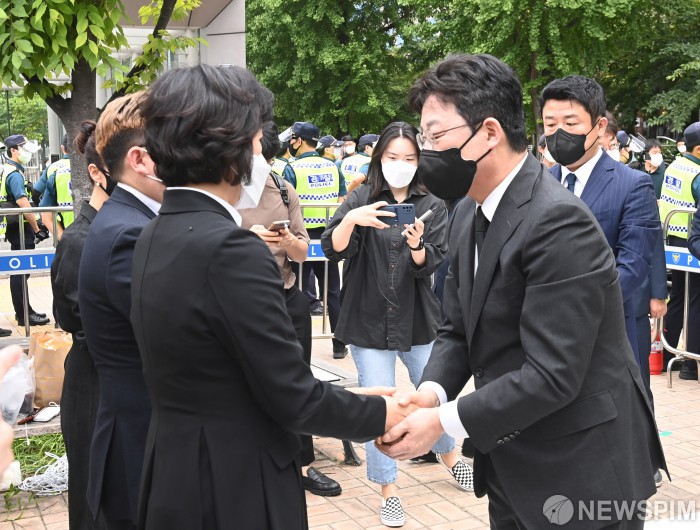 [서울=뉴스핌] 이형석 기자 = 국민의힘 대선주자인 유승민 전 의원이 17일 오전 서울 영등포구 국회 앞에 마련된 숨진 자영업자들의 합동분향소에서 자영업자협회 관계자들을 위로하고 있다. 2021.09.17 leehs@newspim.com