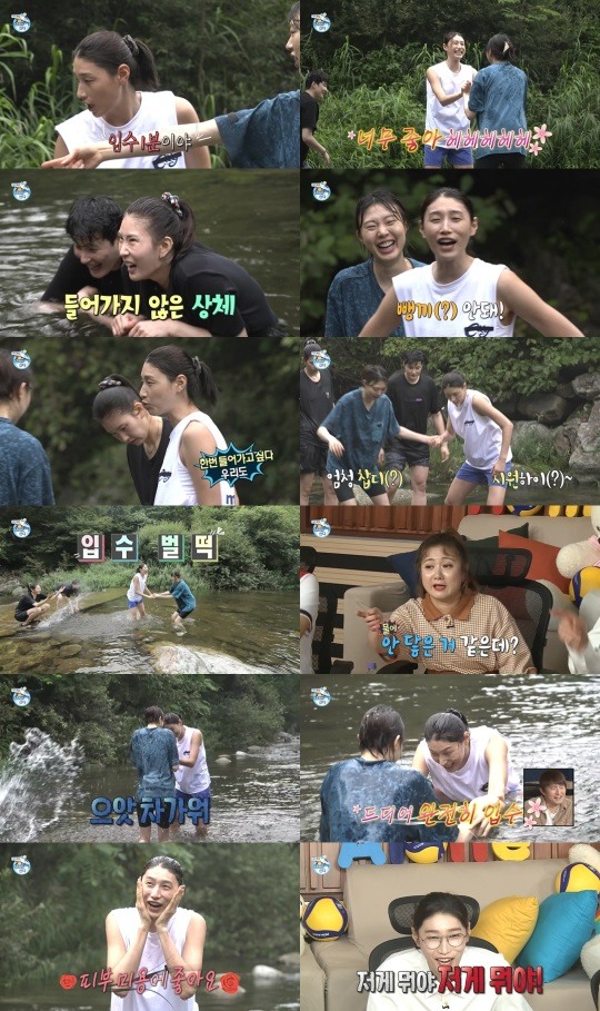 김수지와 김희진은 다리만 살짝 담근 편법 입수를 선보였다. 동작에 비해 과도한 감탄사를 본 김연경은 “뺑끼(?) 안돼”라며 강력한 경고 조치를 취하기도. 김연경은 계곡물 깊숙이 몸을 담근 두 사람을 위해 서비스 물장구까지 선물(?)하며 동심으로 돌아간 시간을 보냈다.