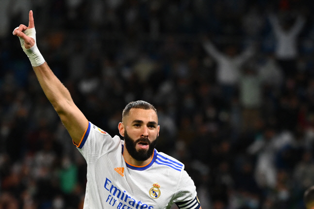레알 마드리드의 카림 벤제마가 22일(현지시간) 에스타디오 산티아고 베르나베우에서 열린 레알 마요르카와의 2021~2022 스페인 라리가 6라운드에서 팀의 5번째 골을 넣은 뒤 세리머니를 하고 있다. 마드리드|AFP 연합뉴스 |