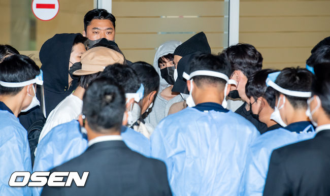 방탄소년단 멤버(RM , 진, 슈가, 제이홉, 지민, 뷔, 정국)들이 귀국하며 방역요원 및 보디가드들에게 둘러싸여 있다. 2021.09.24 / rumi@osen.co.kr