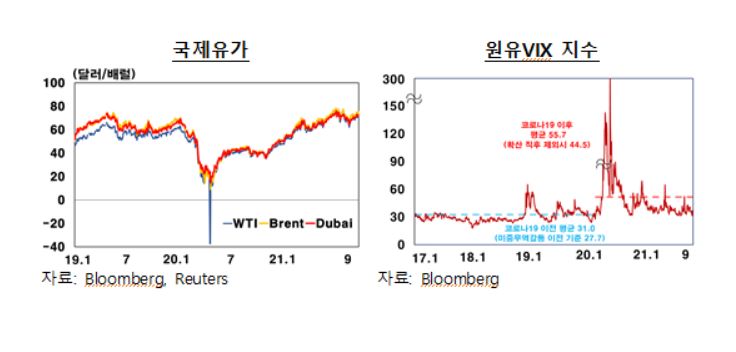 특히 위기 이전보다 높은 유가를 전망하는 이유로는 수요 회복세에 못 미치는 원유공급으로 수급불균형이 지속될 것으로 예상되면서다. 투기자금 유입도 일부 영향을 끼칠 수 있다는 설명이다. 미국, 유럽을 중심으로 원유수요 회복이 예상보다 빨라지면서 원유 재고가 감소하고 있다. 미 셰일오일 증산 제약, OPEC+의 보수적 증산 기조 등도 당분간 이어질 전망이다. 인플레이션 리스크 확대 등에 따른 투자자의 포트폴리오 조정 및 투기자금 유입도 평년(5년 평균 기준)보다 확대됐다.