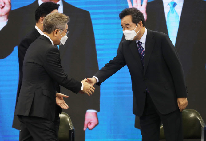 지난 26일 전북 완주군 우석대학교 체육관에서 열린 더불어민주당 대선 후보 선출을 위한 전북 합동연설회 후 이재명 후보와 이낙연,후보가 악수하고 있다 (사진=연합뉴스) |