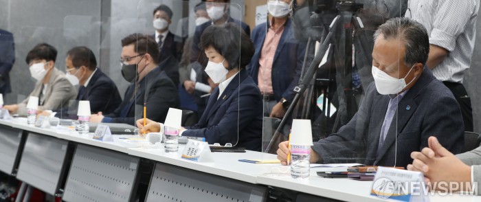 ‘[서울=뉴스핌] 정일구 기자 = 정동식 전국상인연합회장, 오세희 소상공인연합회장, 김기홍 전국자영업비상대책위원회 공동대표 등이 27일 오후 서울 마포구 드림스퀘어에서 열린 코로나19의 성공적 극복을 위한 '소상공인·자영업자 정책 간담회'에서 김부겸 국무총리의 모두발언을 경청하고 있다. 2021.09.27 mironj19@newspim.com