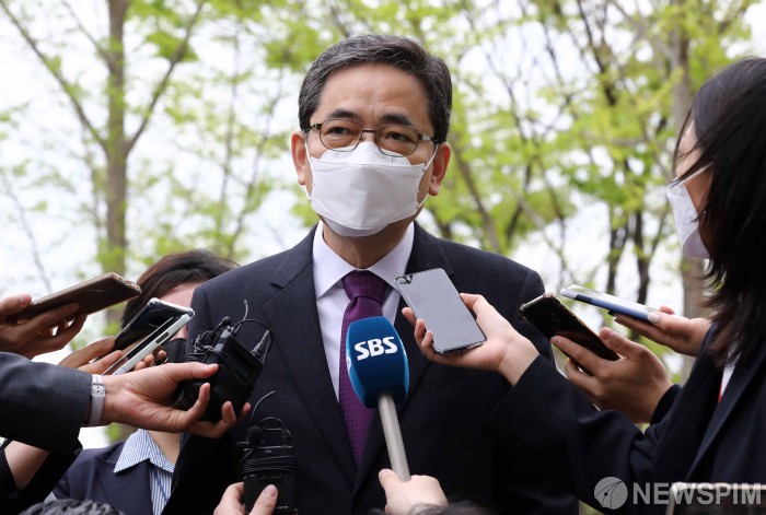 [과천=뉴스핌] 백인혁 기자 = 곽상도 국민의힘 의원이 지난 4월 23일 경기 과천시 정부과천청사 고위공직자범죄수사처에 항의 방문하기 앞서 취재진의 질문에 답하고 있다. 2021.04.23 dlsgur9757@newspim.com |