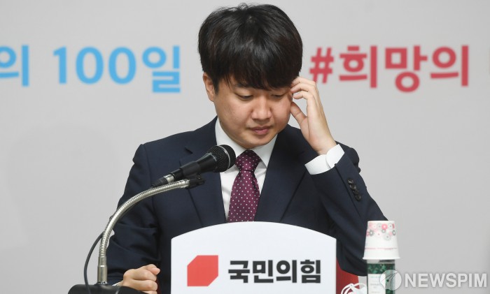 [서울=뉴스핌] 이형석 기자 = 이준석 국민의힘 당대표가 지난 17일 서울 여의도 국민의힘 중앙당사에서 열린 취임 100일 기자간담회에서 얼굴을 만지고 있다. 2021.09.17 leehs@newspim.com |