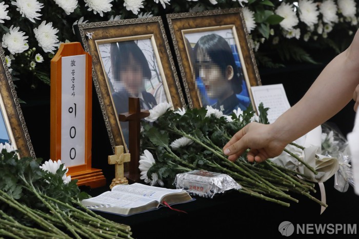 [성남=뉴스핌] 윤창빈 기자 = 지난 7일 오전 경기 성남시 국군수도병원에 마련된 고(故) 이모 중사의 분향소에서 조문객들이 조문을 하고있다. 이 중사는 지난 3월 선임으로부터 성추행을 당했다며 신고한 뒤 두 달여 만인 지난달 22일 숨진 채 발견됐다. 2021.06.07 pangbin@newspim.com |