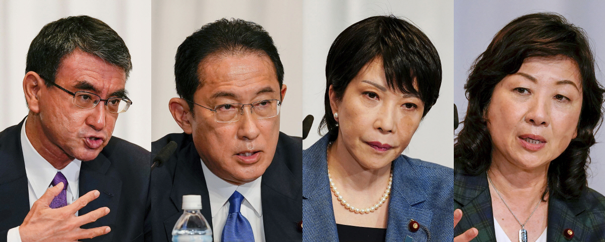 일본 자민당 총재 선거 출마자들. 왼쪽부터 고노 다로 행정개혁담당상, 기시다 후미오 전 자민당 정무조사회장, 다카이치 사나에 전 총무상, 노다 세이코 자민당 간사장 대행. AP연합뉴스 |