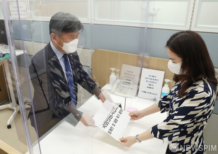 [서울=뉴스핌] 최상수 기자 = 서동용 더불어민주당 의원이 30일 오후 곽상도 의원 징계안 및 제명 촉구 결의안을 국회 의안과에 제출하고 있다. 2021.09.30 kilroy023@newspim.com