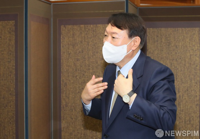 [서울=뉴스핌] 국회사진취재단 = 국민의힘 대권주자인 윤석열 전 검찰총장이 지난 30일 서울 종로구 한국불교역사문화기념관에서 조계종 스님들과 대화하고 있다. 2021.09.30 photo@newspim.com |